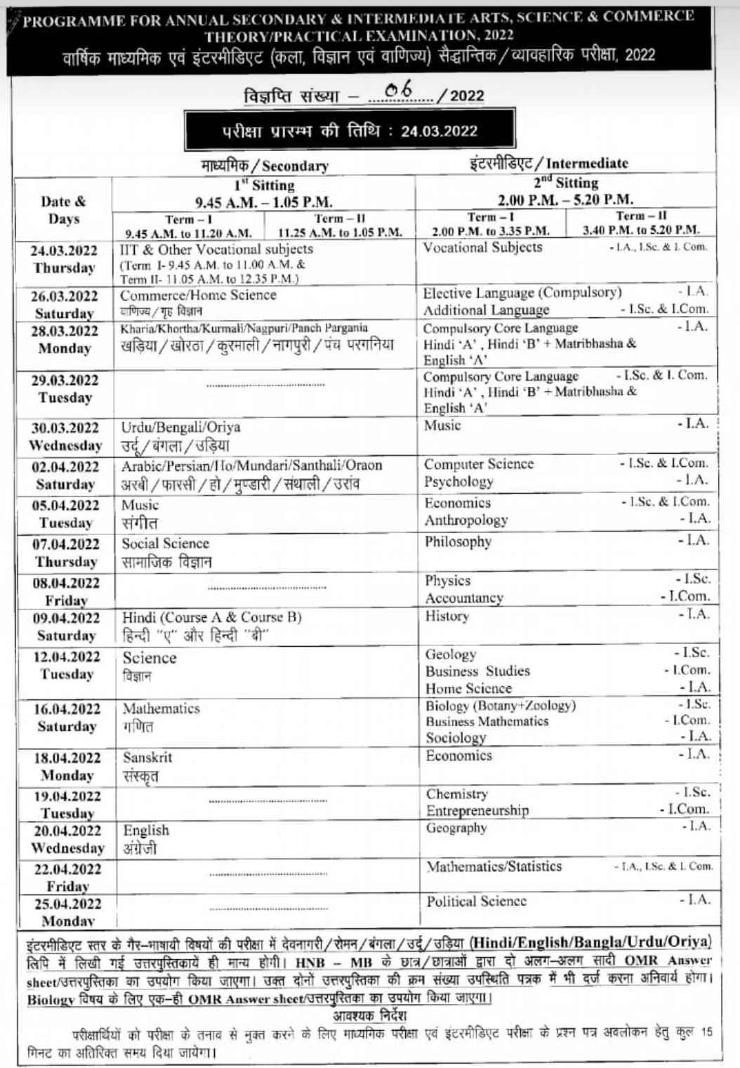 JAC Class 12 Exam और JAC Class 10 Exam आगामी 24 मार्च 2022, दिन गुरुवार से शुरू होगी। मैट्रिक के छात्रों का आखिरी पेपर अंग्रेजी का होगा जो कि 20 अप्रैल 2022 को आयोजित किया जाएगा। वहीं इंटरमीडिएट का आखिरी पेपर पॉलिटिकल सांइस का 25 अप्रैल 2022 को होगा।