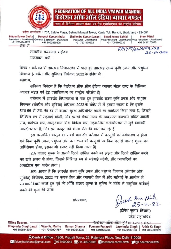 झारखण्ड/राँची : आज दिनांक 25/04/2022 को फेडरेशन ऑफ ऑल इंडिया व्यापार मंडल, झारखंड के 5 सदस्यीय प्रतिनिधिमंडल झारखंड राज्य कृषि उपज और पशुधन विपणन (संवर्धन और सुविधा) विधेयक, 2022 के संबंध में माननीय राज्यपाल महोदय श्री रमेश बैस से मिला और और उनको ज्ञापन देते हुए आग्रह किया कि इस कानून की धारा-66 में जो 2% बाजार शुल्क आरोपित करने का प्रावधान किया गया है उससे महंगाई बढ़ेगी और व्यापारियों को रिटर्न दाखिल करना पड़ेगा और व्यापारी का भयादोहन होने की भी पूर्ण संभावना है, जिसे लेकर झारखंड के खाद्यान्न व्यापारी, आढ़ती संघ, वनोपज संघ, आलू-प्याज थोक विक्रेता संघ, राइस-मिल एसोसिएशन से जुड़े व्यापारीगण आंदोलनरत हैं।