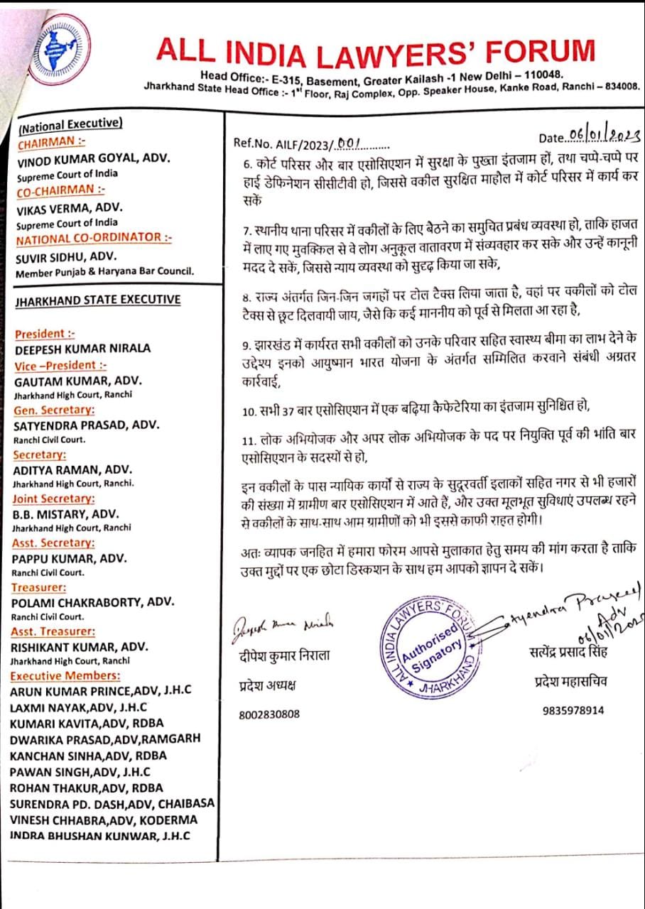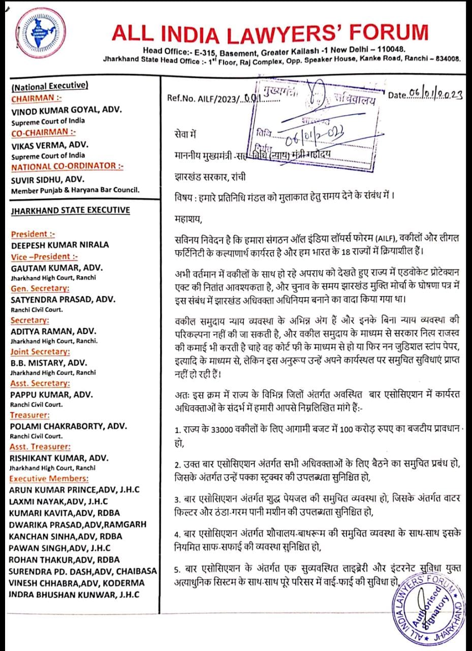 झारखण्ड/राँची : ऑल इंडिया लॉयर्स फोरम के प्रदेश अध्यक्ष दीपेश कुमार निराला और प्रदेश महासचिव सत्येंद्र प्रसाद सिंह ने झारखण्ड के मुख्यमंत्री सह विधि मंत्री को पत्र लिखकर झारखंड एडवोकेट प्रोटेक्शन एक्ट लागू करने सहित झारखण्ड के 37 बार एसोसिएशनों के अंतर्गत कार्यरत 33000 अधिवक्ताओं के 11 सूत्री बुनियादी सुविधाओं की मांग करते हुए एक पत्र लिखा है।