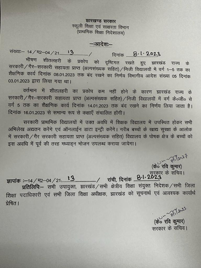 आम मुद्दे झारखण्ड ताज़ातरीन राजनीति राज्य शिक्षा कक्षा 1 से 5 तक के सभी विद्यालय हुए बंद आकाश भगत January 8, 2023 सरकार के सचिव ने ज़ारी किया आदेश झारखण्ड/राँची : राज्य में इन दिनों प्रचंड ठंड का प्रकोप जारी है। जिसके चलते राज्य सरकार ने कक्षा 1 से 5 तक के स्टूडेंट को राहत देते हुए सभी स्कूल 15 जनवरी 2023 तक बंद रखने का आदेश जारी कर दिया है। Post Views: 464 Post navigation Previous: Magh Month 2023: स्नान, दान का महत्व, जानें किन उपायों से मिल सकती है पाप कर्मों से मुक्तिNext: Sankashti Chaturthi पर ऐसे करें श्री गणेश की आराधना, जानें पूजा विधि, मुहूर्त और चंद्रोदय का समय More Stories आम मुद्दे क्राइम झारखण्ड पाकुड़ राज्य पत्थर खनन में पैसे वालों का बोलबाला : हैवी ब्लास्टिग कर उड़ाई जा रही नियमों की धज्जियां, गरीबों की जान से खिलवाड़ आकाश भगत October 26, 2025 झारखण्ड पाकुड़ राजनीति राज्य साहेबगंज हजारों लोगों द्वारा किए गए हस्ताक्षरों की प्रतियां प्रदेश कांग्रेस अध्यक्ष को सौंपीं आकाश भगत October 25, 2025 आम मुद्दे झारखण्ड पाकुड़ स्वास्थ्य उपायुक्त ने 23वीं बार किया रक्तदान, पाकुड़ में चौथी बार आकाश भगत October 24, 2025 Leave a ReplyYour email address will not be published. Required fields are marked *Comment * Name Email Website