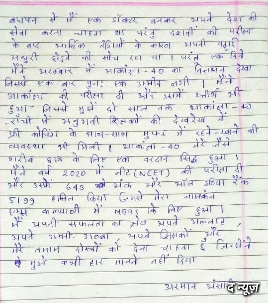 झारखण्ड/पाकुड़, अमड़ापाड़ा (आकाश भगत) : स्कूली शिक्षा एवं साक्षरता विभाग द्वारा संचालित ” आकांक्षा ”(निशुल्क मेडिकल एवं इंजीनियरिंग चयन परीक्षा हेतु आवासीय कोचिंग) कार्यक्रम के तहत उत्कृष्ट प्रदर्शन करने वाले आर एल टी उच्च विद्यालय रोलाग्राम ,महेशपुर के पूर्ववर्ती छात्र अरमान अंसारी जिन्होंने आईआईटी (जेईई एडवांस परीक्षा 2020) तथा मेडिकल नीट 2020 के आधार पर भारत सरकार के प्रतिष्ठित प्रौद्योगिकी एवं मेडिकल कॉलेज में चयनित होकर राज्य सरकार के सरकारी विद्यालयों के अन्य बच्चों के लिए प्रेरणा का काम किया है।
