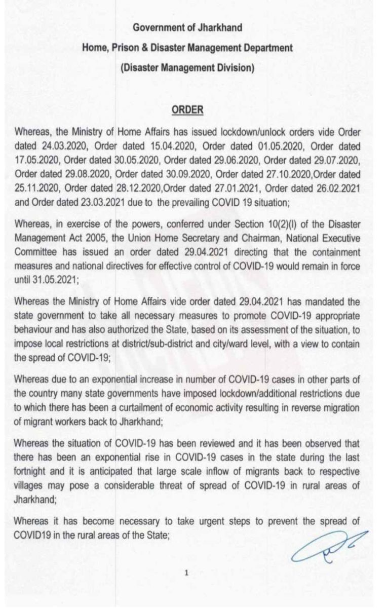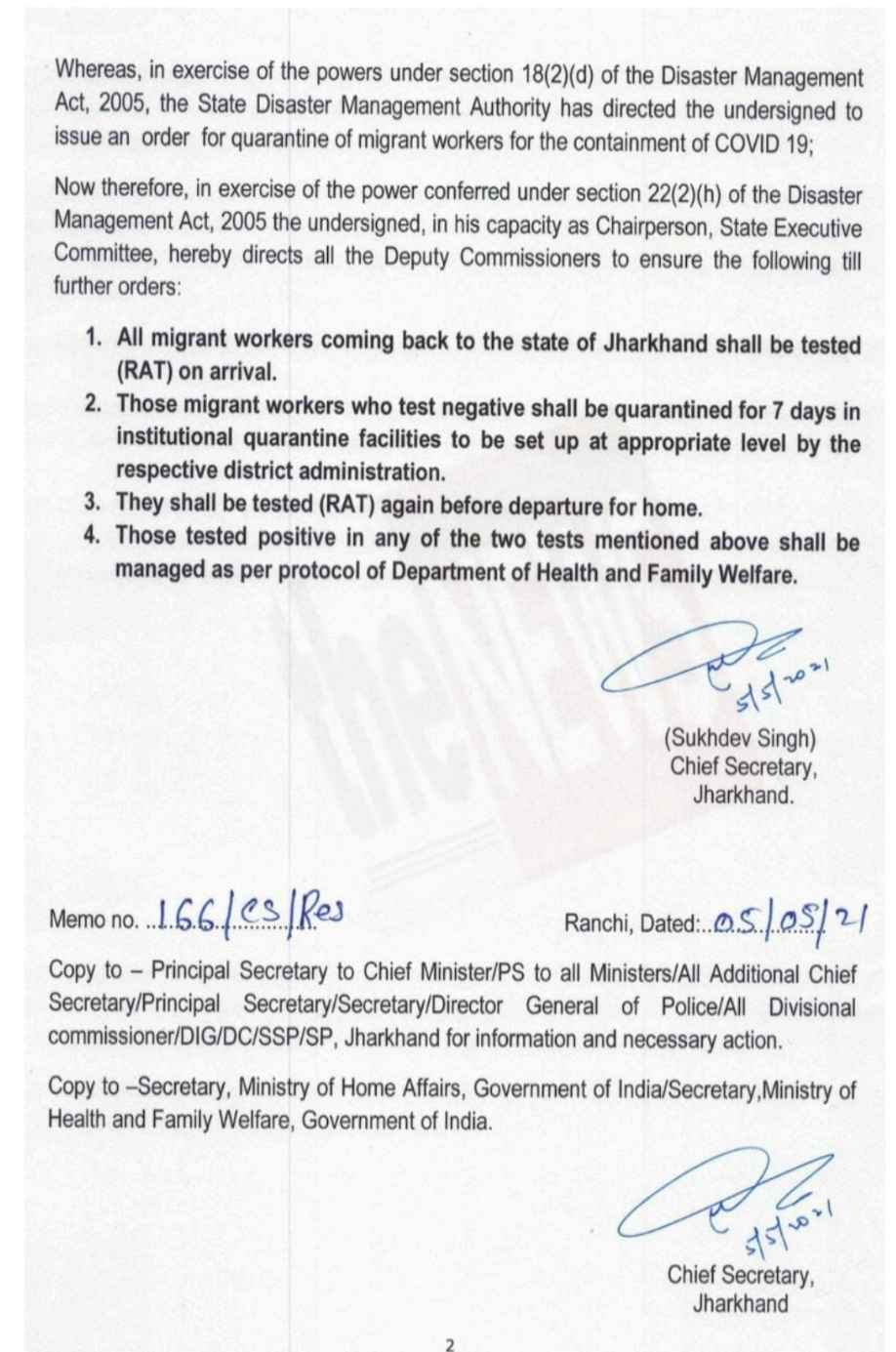 जारी आदेश में कहा गया है कि देश के कई राज्यों में कोरोना के बढ़ते मामले को देखते हुए लॉकडाउन लगा है, ऐसे में वहां काम कर रहे झारखण्ड के मजदूर वापस आयेंगे। उनके वापस आने से राज्य के ग्रामीण इलाकों में कोरोना के केस बढ़ने के आसार हैं। ऐसे में उन्हें रोकने का समुचित प्रबंध करना होगा।