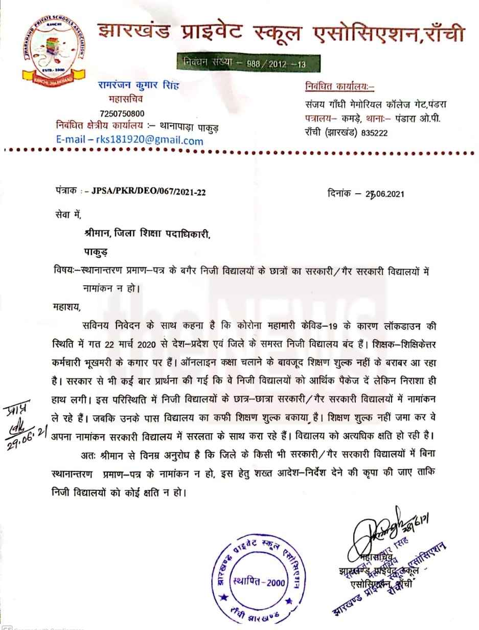 झारखण्ड प्राइवेट स्कूल एसोसिएशन, राँची के महासचिव रामरंजन कुमार सिंह ने जिला शिक्षा पदाधिकारी एवं जिला शिक्षा अधीक्षक, पाकुड़ को पत्र के माध्यम से अनुरोध किया है कि स्थानांतरण प्रमाण-पत्र के बगैर निजी विद्यालय के छात्र-छात्राओं का सरकारी या गैर सरकारी विद्यालयों में नामांकन न हो।